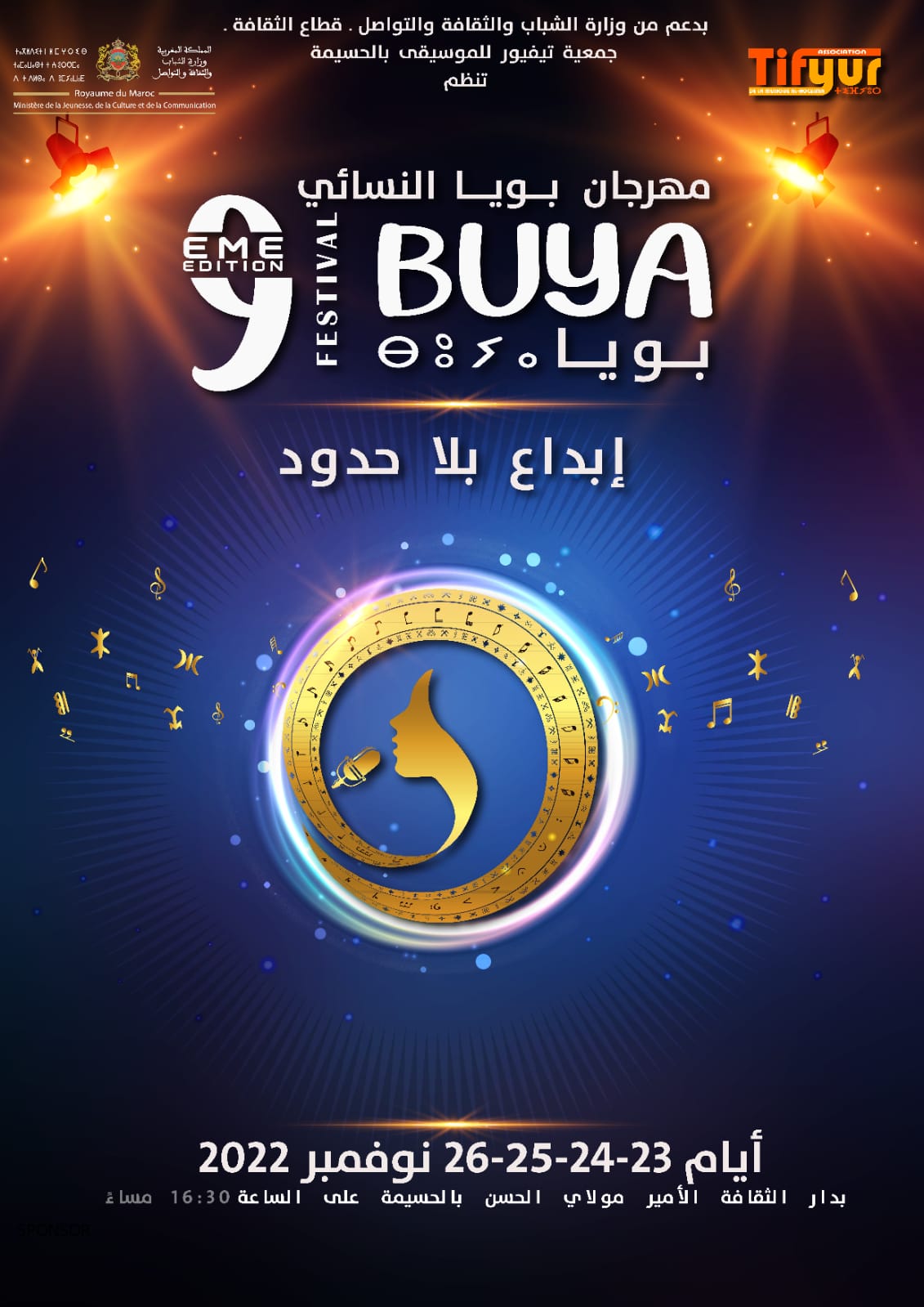 اعلنت جمعية تيفيور للموسيقى؛ عبر بلاغ صدر لها أخيرا؛ انها بصدد وضع اللمسات الاخيرة لتنظيم الدورة التاسعة لمهرجان “بويا النسائي،” خلال الفترة الممتدة من 23 نونبر 2022 الى غاية 26 منه وذلك بدار الثقافة الأمير مولاي الحسن بالحسيمة، تحت شعار”إبداع بلا حدود” بدعم من وزارة الشباب والثقافة والتواصل، وبتعاون من المكتب المغربي لحقوق المؤلفين، مجلس جهة- طنجة- تطوان، وكالة إنعاش وتنمية الشمال، جماعة الحسيمة وشركاء أخرون.