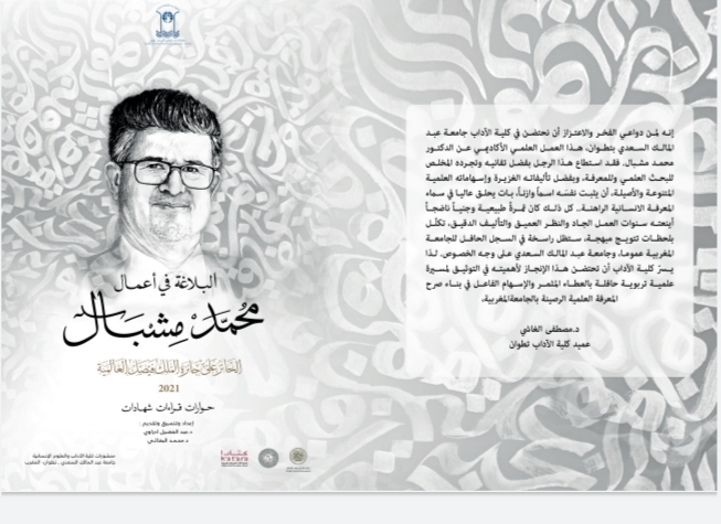 كتاب “البلاغة في أعمال محمد مشبال”(2021) الذي نشرته كلية الآداب بتطوان بمناسبة حصول الدكتور محمد مشبال على جائزة الملك فيصل لعام 2021، اشتمل على مقدمة السيد عميد الكلية الدكتور مصطفى الغاشي ومقدمة الأستاذين الجامعيين عبد الفضيل أدراوي ومحمد البقالي اللذين قاما بتنسيق مادة الكتاب، وثلاثة فصول وملحق.